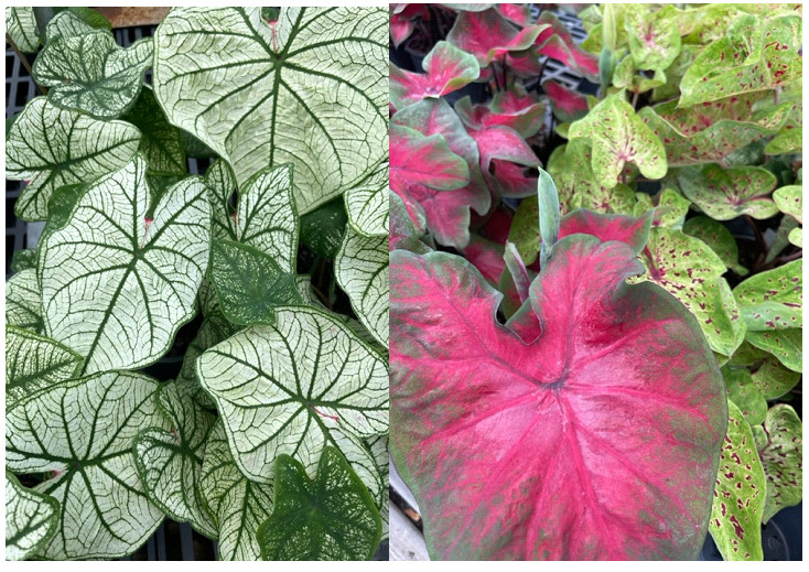-Caladiums come in a variety of colors, patterns and sizes. A fast growing, tropical foliage plant, they're great for containers, baskets and boarders. Caladiums thrive in morning sun with well drainging moist soil and would make a great addition to any shady area in your garden.