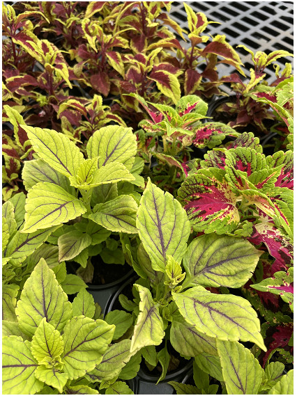 -Coleus are a tender perennial, they come in a variety of colors, shapes and patterns. Coleus love morning sun, shade and heat, they're great for mass planting in garden beds or in container planting. They prefer a rich, moist soil with good drainage, pinch stem tips to promote branching and a fuller,bushier plant.
